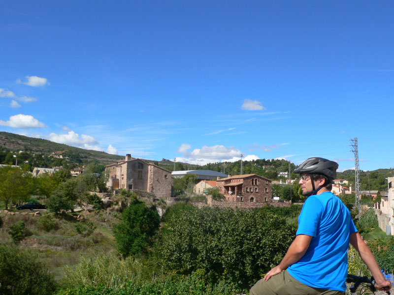 › Subimos a Manresa con los F.G.C. que salen de Plaza Espanya, linea R5. Una hora y 20 minutos de trayecto hasta Manresa-Baixador. Hay vagones preparados para dejar colgadas la bicicletas de un gancho.