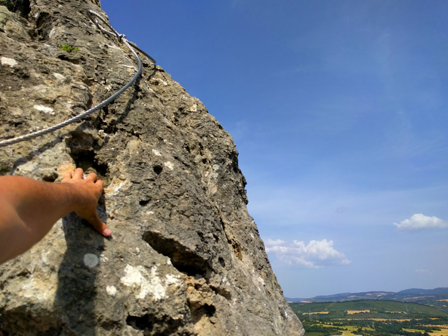 Aquí empiezan las primeras complicaciones, 250 metros equipados con una dificultad K3 donde no faltan los pasos incómodos y con pocas grapas. Iremos alternando las dos caras de la cresta con cortos pasos por el filo y algún destrepe bien equipado con grapas. Sin ser muy aéreo, lo estrecho de los pasos hacen aumentar el factor psicológico. Los habituados a la vía ferrata más equipada tenemos que esforzarnos en buscar las presas en la pared. Como en todo el recorrido las vistas a ambos lados de la arista no tienen desperdicio pero sobretodo son amplias al este siguiendo el serpenteo del río hacia Miranda de Ebro.