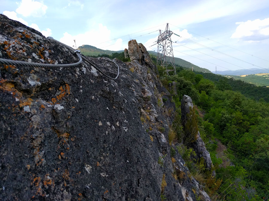 Durante toda la ferrata un sendero avanza paralelo por la cara este de la cresta. Al terminar la ferrata bajamos para enlazar con esta senda que primero va muy pegada a la pared y tiene tramos equipados. Ojo si hay gente en la vía que podría caer algo. Después de la torre de alta tensión -final del segundo tramo- la senda se vuelve un camino ancho que nos deja a tocar del balneario abandonado.