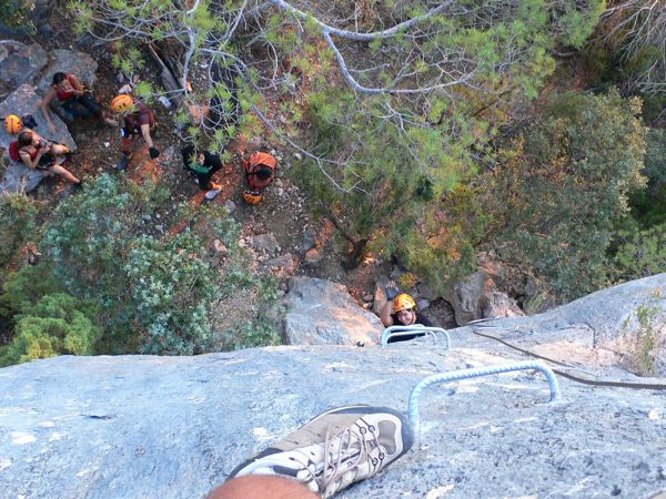 Nuestra sorpresa fue al ver desde abajo que las grapas de la primera parte estaban muy espaciadas y la pared era bastante desplomada, dificultando el primer tramo de cuatro o cinco grapas. Del grupo de ocho personas sólo subieron dos hasta la Torreta dels Moros, los demás no pudieron pasar del desplomado. Esta entrada tiene un factor fuerza de por lo menos 5, por lo tanto no es recomendado para iniciar a nadie.