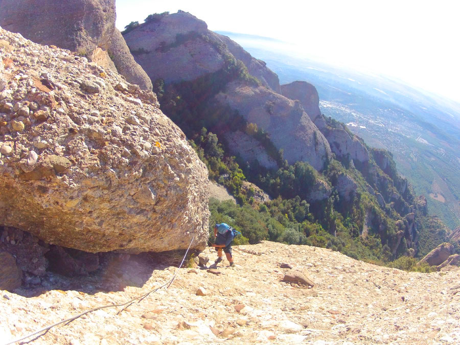 Aquí cal tindre en compte que ens espera un llarg ràpel de 60 metres, flanquejant lleugerament a la nostra dreta, mirant la paret, a la part de sota, per assolir el collet per on passa la sendera.