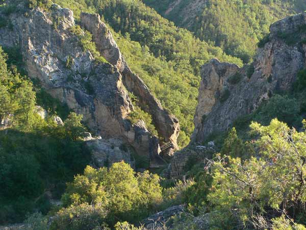 Retrocedemos por la misma pista a pie unos 200 metros y seguimos a la izquierda el GR y el cartel Observatorio de aves. Avanzamos por la pista de tierra y en todos los cruces seguimos las marcas de GR. Primero a la derecha, luego a la izquierda en bajada y otra vez a la izquierda llaneando hasta llegar a un campo y dos caminos paralelos que descienden fuertemente. Tomamos el más cercano al campo y empezamos a bajar. Pronto veremos el río e intuiremos en el congosto alguno de los puentes tibetanos.