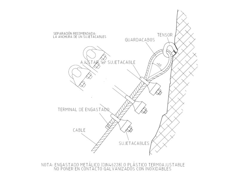 1. Tendremos igual precaución en travesías o en tramos más horizontales, considerando cualquier quiebro de la pared para colocar el tensor en el lugar adecuado, intentando que el tramo de cable no roce en las aristas.