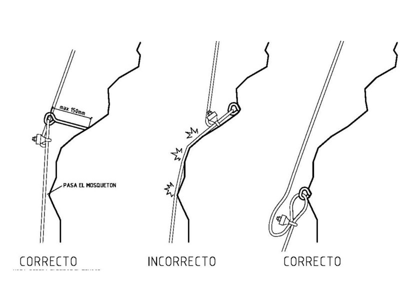 1. Cuando avancemos en progresión vertical hay que colocar el anclaje de forma que el cable quede destensado durante su uso y no roce con alguna arista de roca que encuentres (puedes picarla ligeramente si una arista especialmente cortante lo hace peligrar) para evitar que el roce del cable con la arista provoque la rotura de los alambres.