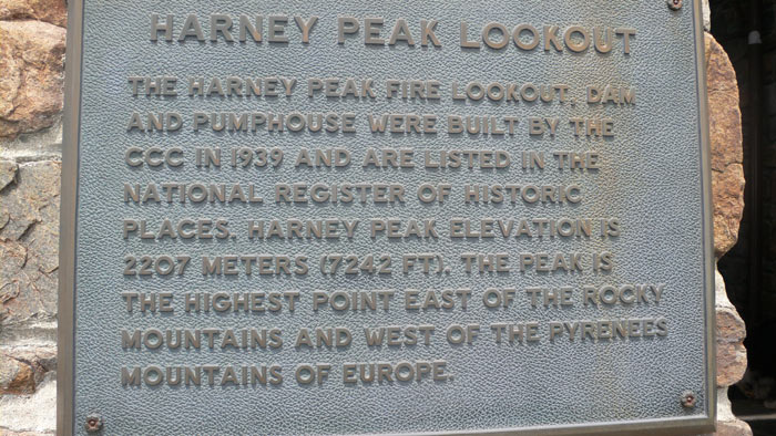 En una curiosa placa conmemorativa en la cima de Harney Peak podemos leer: "... la altura del Harney Peak es de 2.207 m. La cima es el punto más alto al Este de las Montañas Rocosas y al Oeste de las montañas del Pirineo en Europa." Creo que por lo menos el Teide y el Toubkal tienen algo que decir a esto.