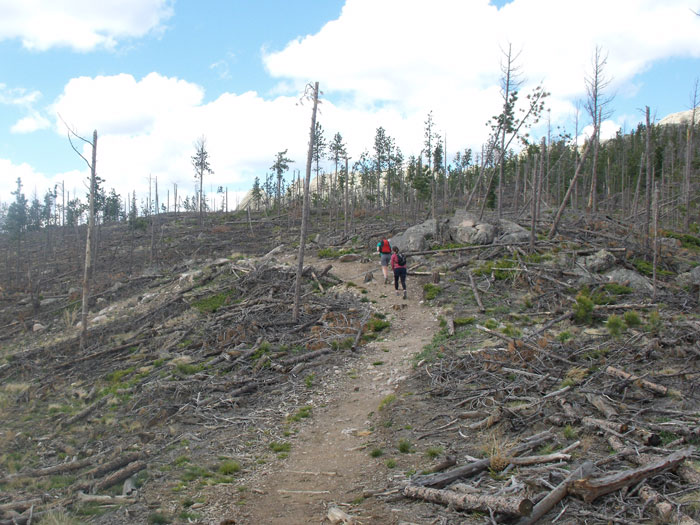 Desde la cima constatamos lo que más sorprende en el camino, el bosque del Black Elk es espectacular pero también por zonas devastado, el escarabajo de pino negro ha hecho estragos y muchos árboles han muerto. Para acabar con la plaga los trabajos de restauración de los forestales son muy agresivos, es una tarea titánica que el cambio climático hace cada día más complicada. Da pena.