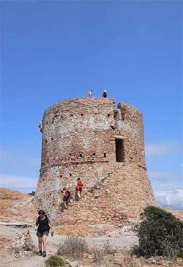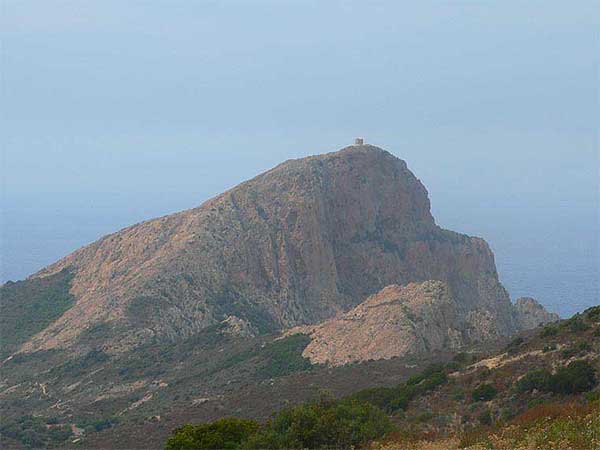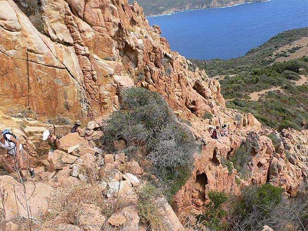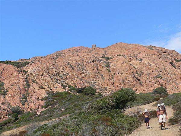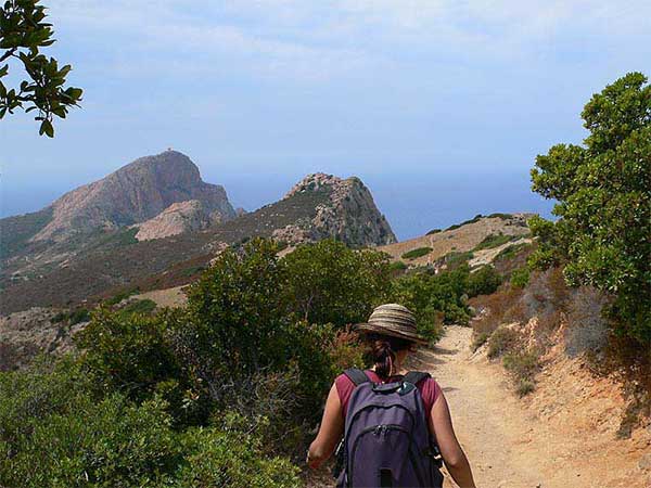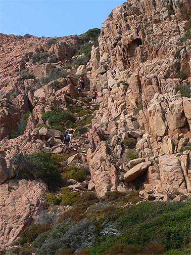 El camino es duro, pues la vegetación de arbustos mediterráneos (maccia) es muy baja y el sol azota sin tregua. Contados son los árboles en donde nos acoge una sombra y además plagados de gente, lo mejor es llevar mucha agua y no olvidar el gorro. Rodeamos la montaña, siempre acompañados de las omnipresentes vistas al mar y atacamos la subida al cabo por la vertienete oeste, una canal de roca granítica y rosácea que debemos subir como si fuese una gran escalinata. Un poco más arriba zigzagueamos por un camino indistinguible señalado con hitos.