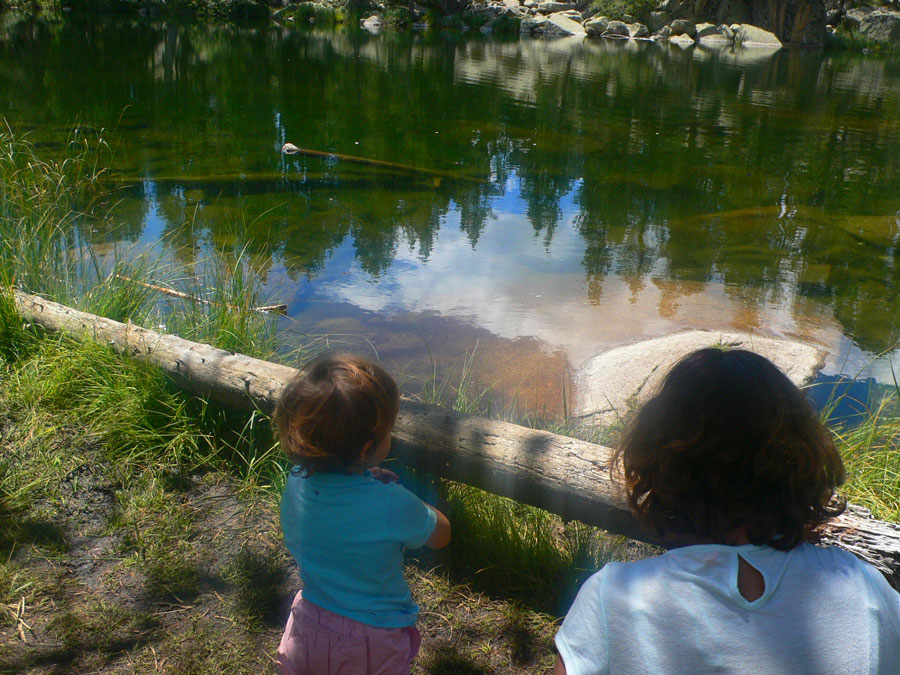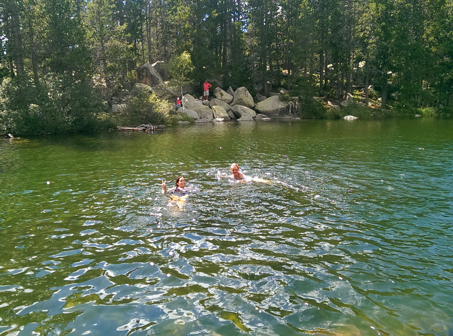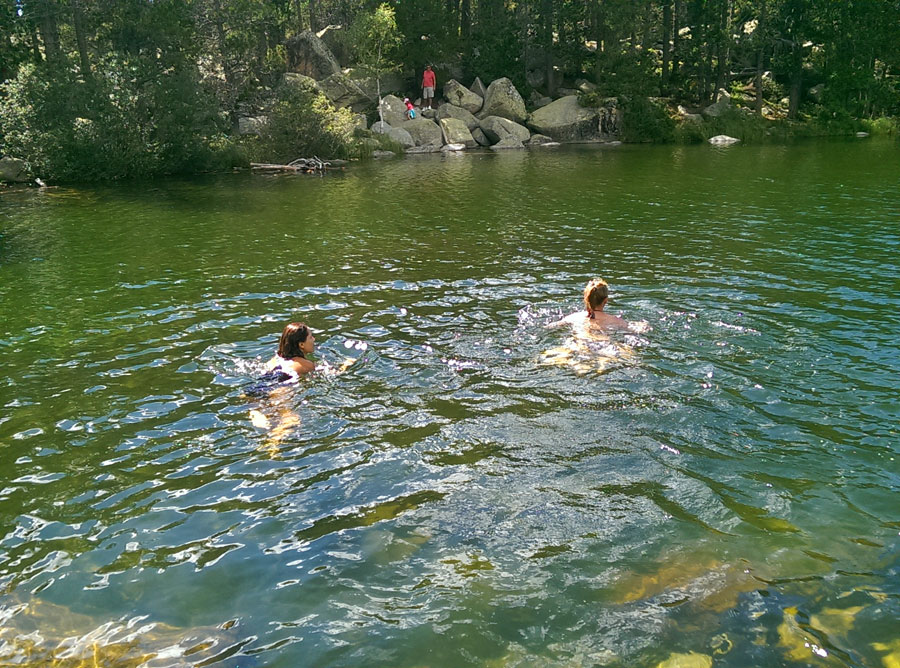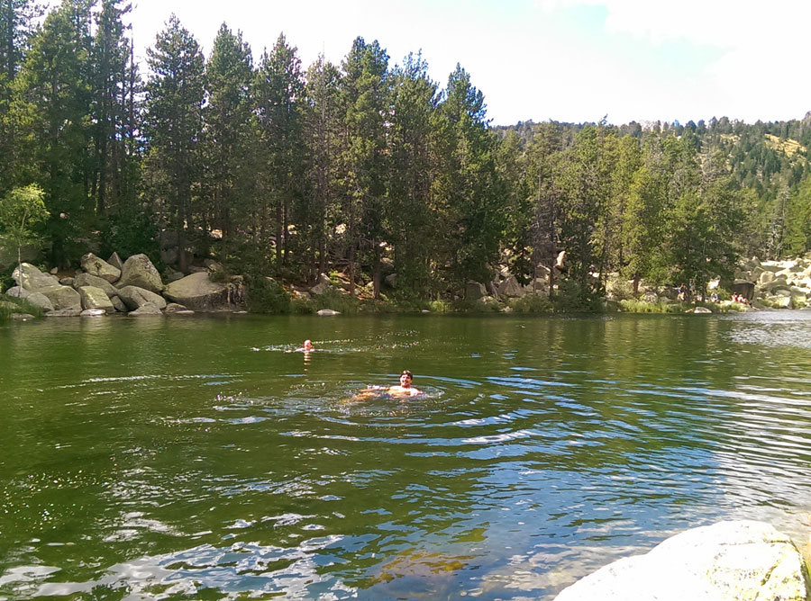 En pleno verano y si el día acompaña es posible remojar los pies aquí aunque el agua es muy fría. Haberlos remojado nos ayudará si queremos hacer un chapuzón en el lago dónde la temperatura del agua es algo superior. Hay una buena entrada en el lado sureste a pocos metros del camino de acceso. Facilita las cosas una piedra que a modo de rampa nos permite acceder con seguridad. Además no hay muchas algas ni restos vegetales y toca el sol, imprescindible para hacerlo más confortable.