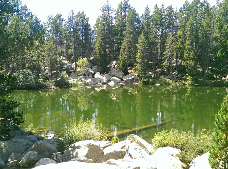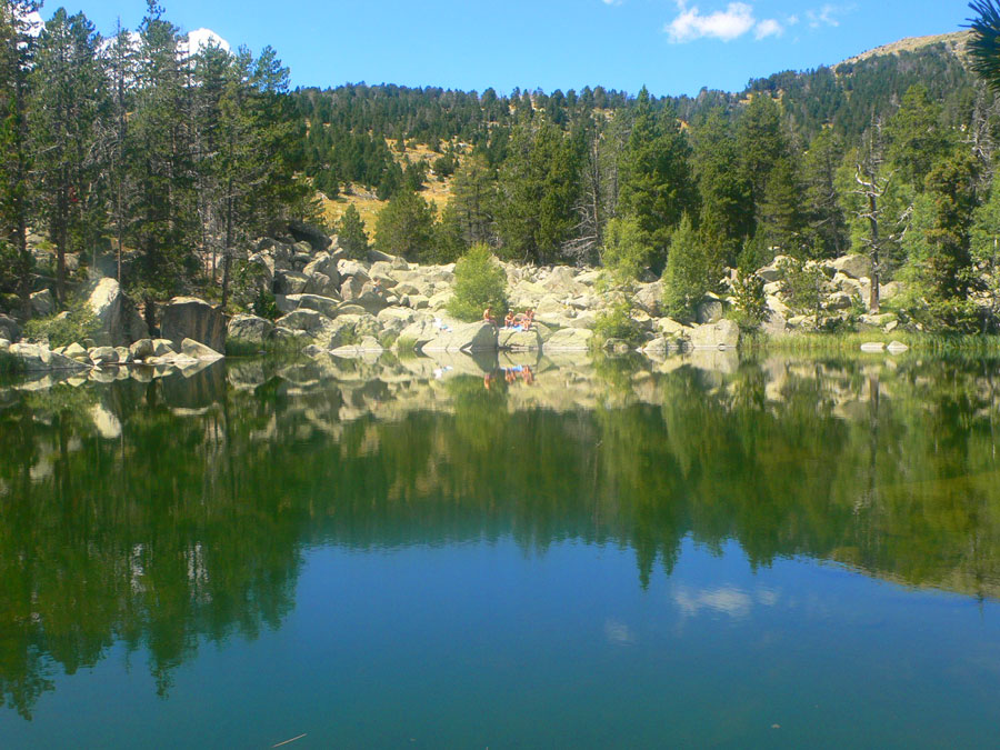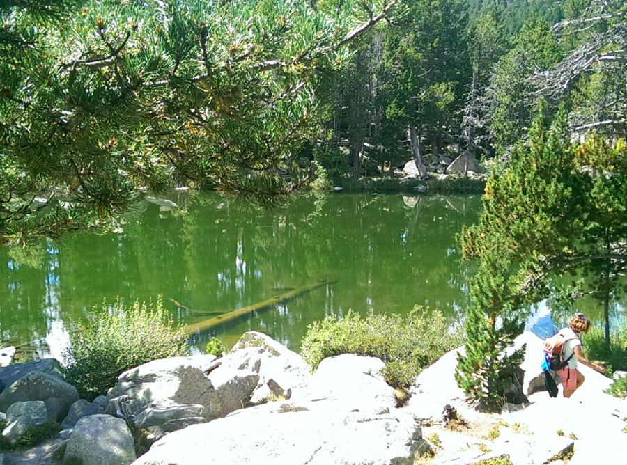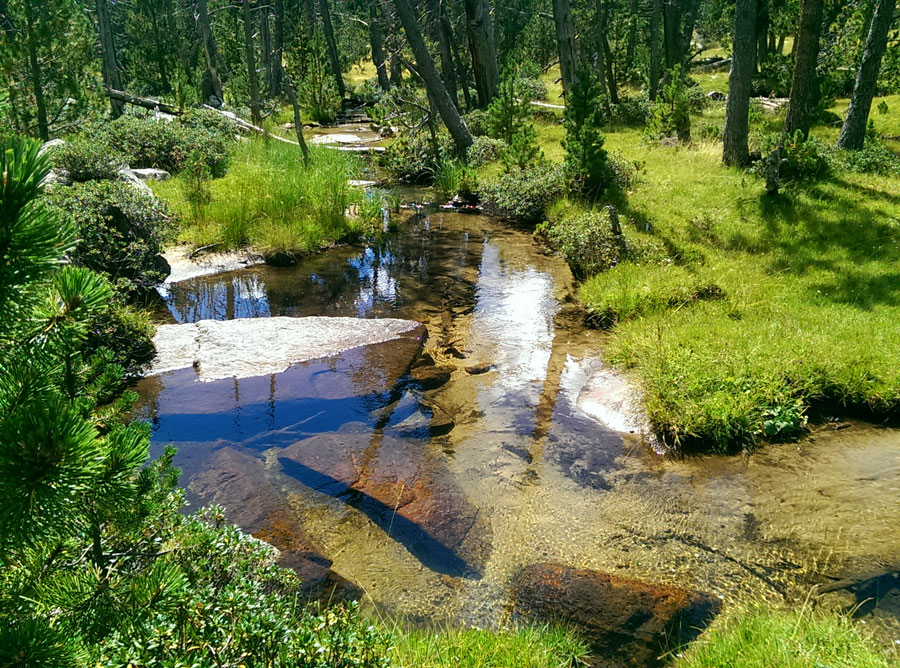 Una vez en el lago nos ponemos a explorar los alrededores. Lo bordeamos por el norte donde tenemos que sortear unas grandes rocas de una tartera. Nos paramos a descansar en el idílico rincón del torrente del Orri donde se forman unos meandros que nada tienen que envidiar a los de Aigüestortes.
