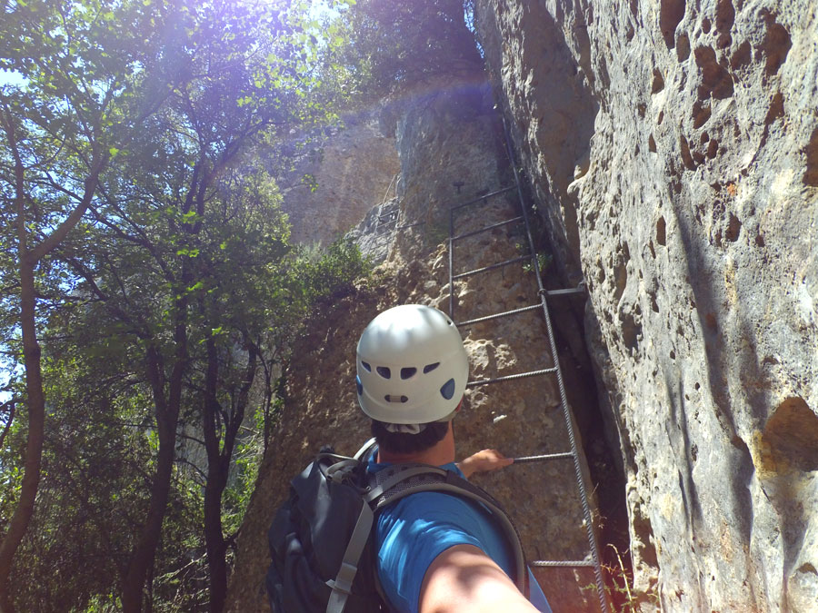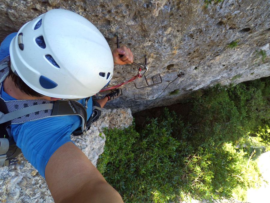 Seguimos las indicaciones del PR para dar con el Carabassal inferior que supera otra verticalidad con diversos pasos equipados, una escalera metálica de unos 5 metros algo estrecha y después cable de vida en algunas zonas quizá innecesario. Es en general bastante más fácil que la sección superior.