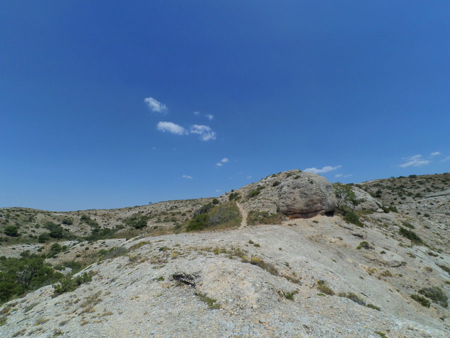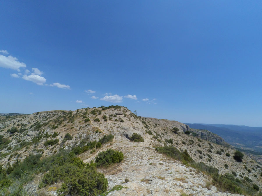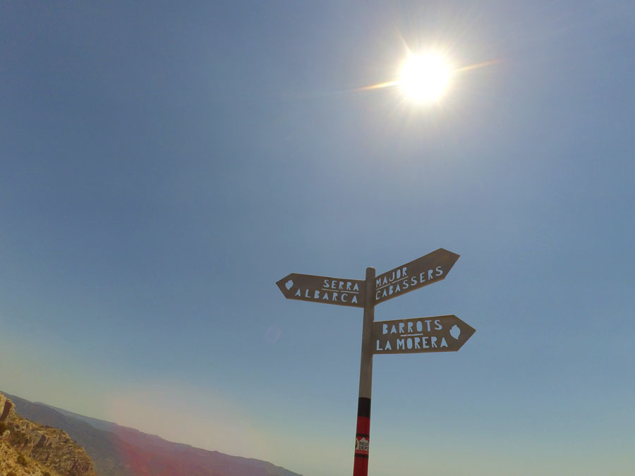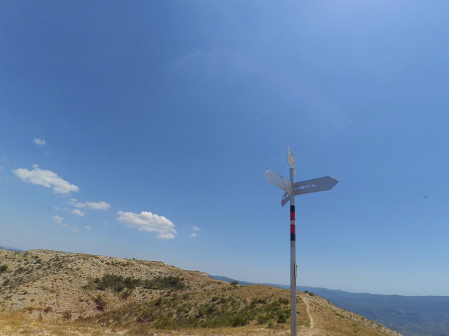 Seguimos el camino más pisado y los hitos sin perder la orientación siempre al noreste. Subiremos y bajaremos por el cordal e iremos encontrando postes metálicos verticales con indicadores de GR y PR. No hay casi árboles ni zonas protegidas del sol ni del viento en la parte alta. Al llegar al indicador que nos baja al Carabassal, después de haber caminado unos 1,7 km, iremos en dirección contraria a la que veníamos haciendo una amplia curva a la derecha.