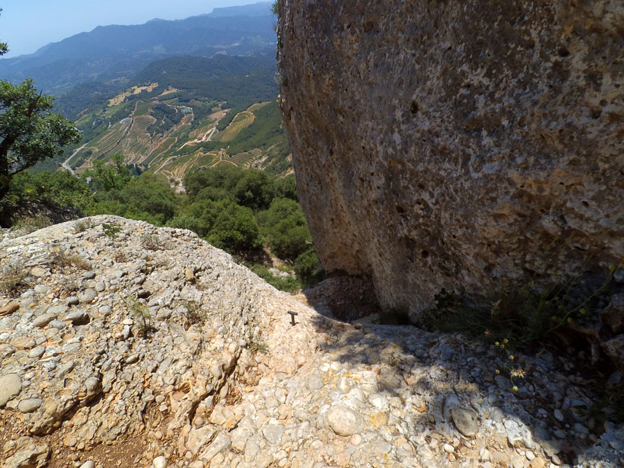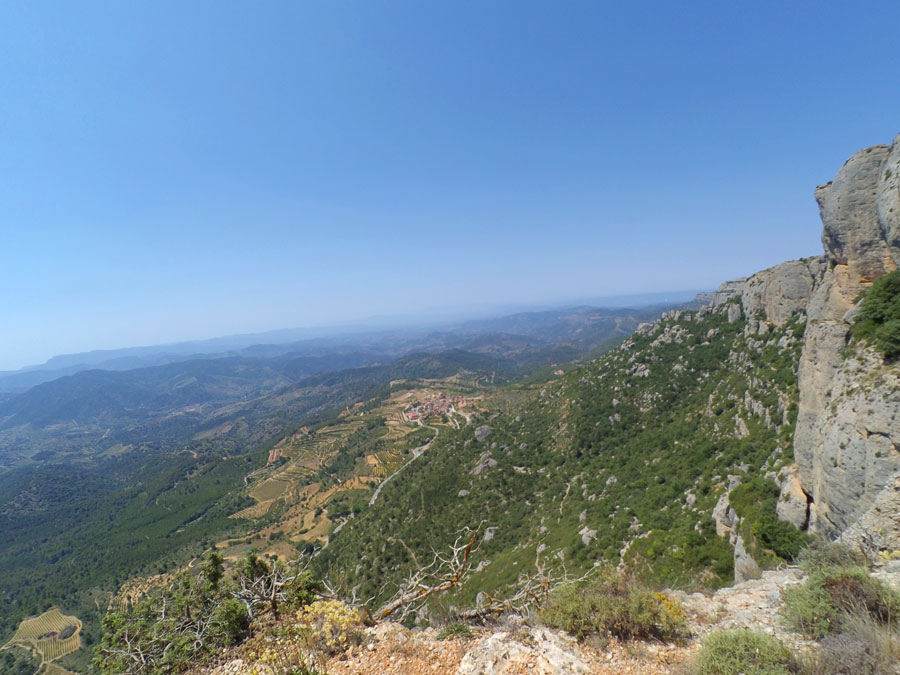 Un camino estrecho y asomado a la grieta nos permite salir del grau. Seguimos la senda que va por una cornisa aérea hasta llegar al Balcó del Priorat, donde después de superar un paso equipado con una baranda disfrutaremos de grandes vistas de la comarca.