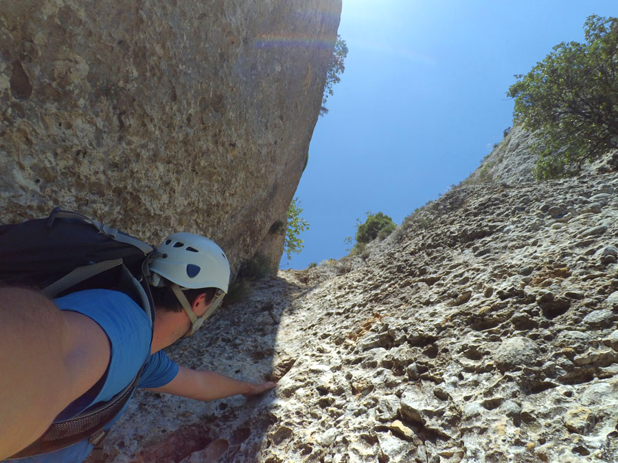Al final del grau podríamos regresar a la Morera de Montsant acortando la salida a la mitad pero todavía nos falta visitar el grau del Carabassal que se encuentra 2 km al noreste. Subimos de nuevo por el Carrasclet y vamos a mano derecha para encontrar una zona estrecha entre rocas, un corto pasadizo que nos da acceso a la zona alta de la sierra.