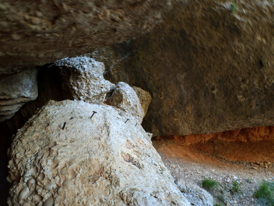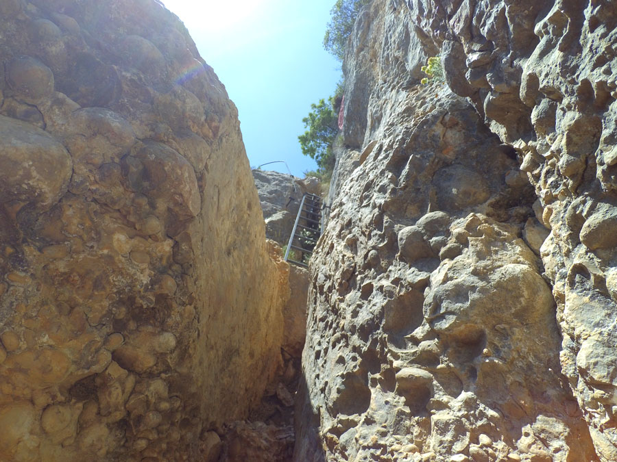 Seguimos hacia el fondo y parece que no se puede continuar. Si observamos bien veremos una repisa a mano izquierda que sube en dirección contraria. Tomamos el pasadizo agachados hasta llegar a una roca empotrada que hace de puente para pasar al otro lado de la grieta. Hay "barrots" y huecos tallados para poner los pies.