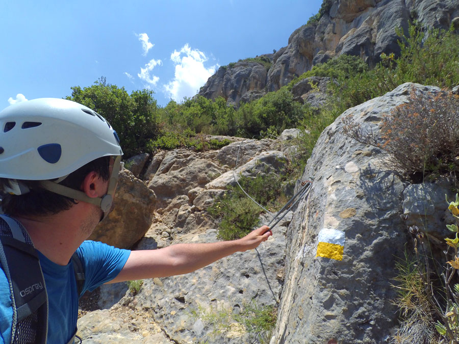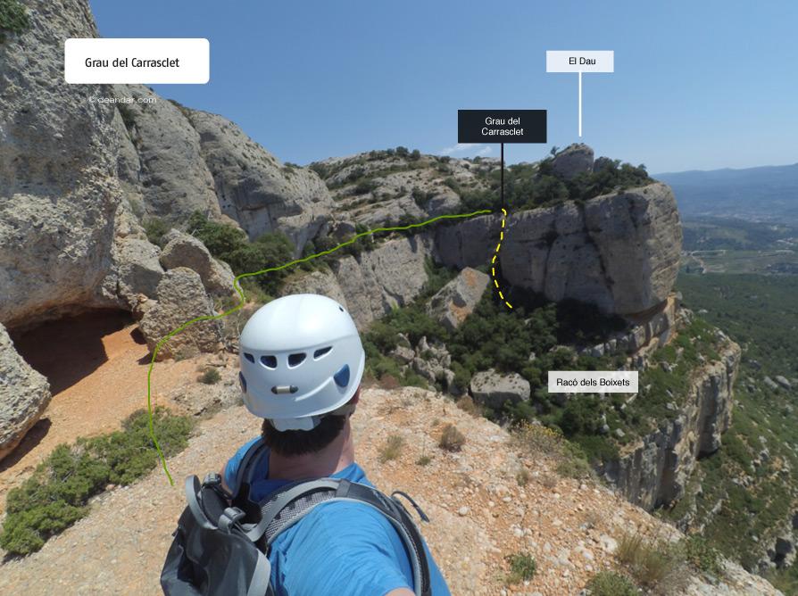 Caminando por un tramo largo equipado con cable quita miedos que se asoma al Racó dels Boixets, una entrada de las paredes frontales de la sierra, veremos al frente en una esquina una zona con vegetación en la que se encuentra escondido el grau del Carrasclet. La entrada está indicada con un poste metálico después de pasar unas amplias viseras naturales.
