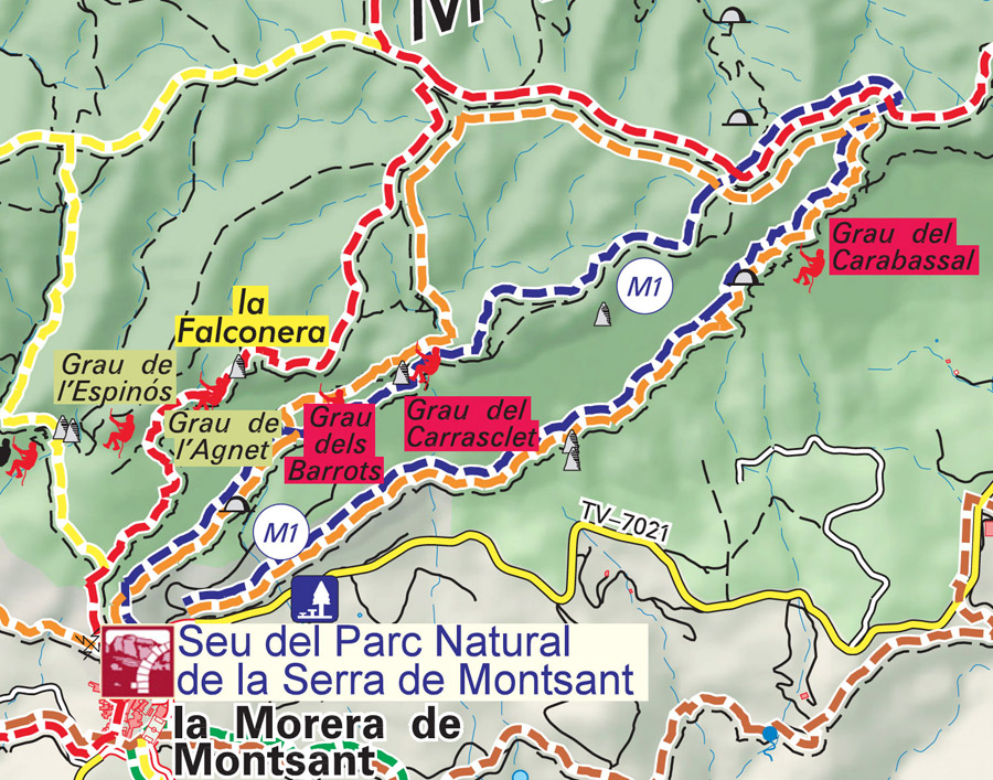 El itinerario M1 oficial del parque es la ruta perfecta para visitar los graus más espectaculares de la sierra del Montsant. Para coleccionistas de pasos equipados o para aquellos que quieren visitar miradores de vértigo sobre el Priorat es una ruta a tener en cuenta. Deben abstenerse los aprensivos a las alturas y los niños igual que ir con mascotas, los pasos son sencillos pero lo suficientemente verticales como para ser un obstáculo para ellos.