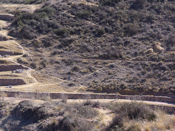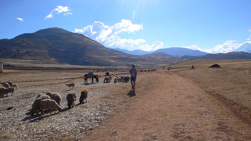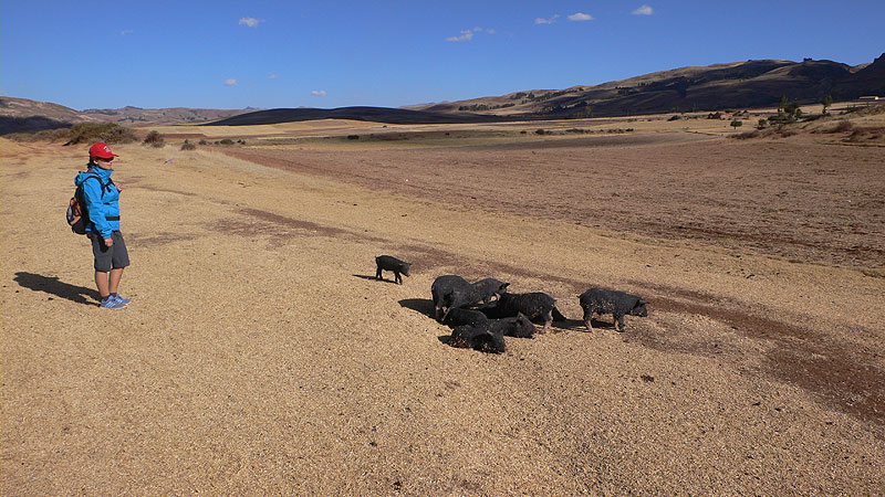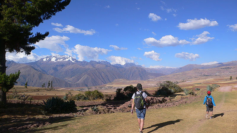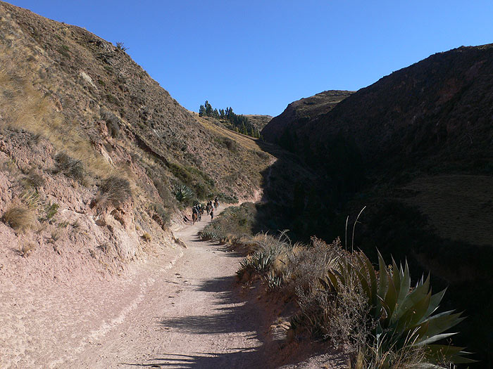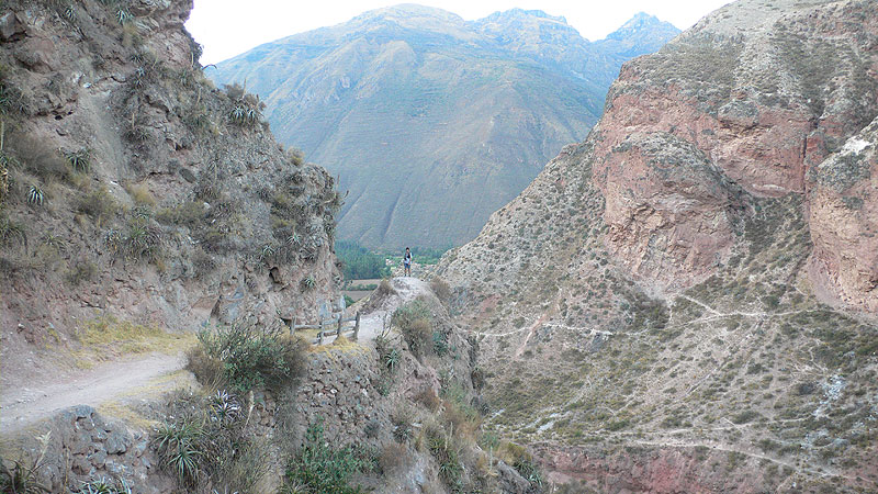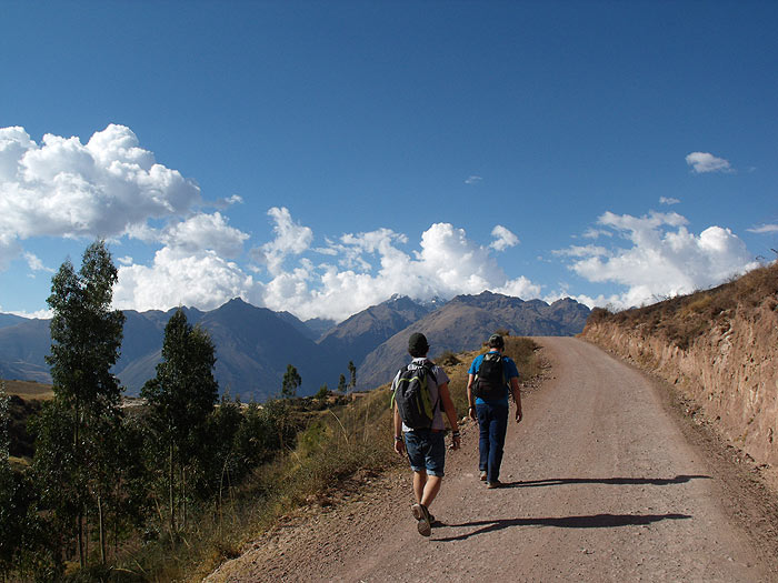 Saliendo de Moray tomamos la pista de acceso por la que hemos llegado en coche, para dejarla de frente justo cuando el camino hace un fuerte giro a la derecha, después de haber cruzado una hondonada. Podríamos regresar por la misma carretera pero es una opción polvorienta y que da mucho rodeo. Ir directamente hasta las salinas de Maras sin pasar por el pueblo de Maras es más rápido pero puede ser perdedor. Es poco recomendable si no se va con un guía local.