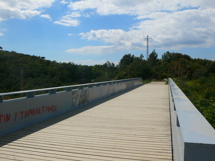 Poco después tenemos a la vista el característico Turó de Montcada. Sin saber muy bien el trazado del PR esperábamos llegar a un mirador que se ve desde la autopista. Pero no, cruzamos la C-58 por un amplio puente un poco más adelante, el mirador nos queda lejos en dirección Barcelona, en otra ocasión lo visitaremos.