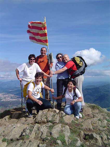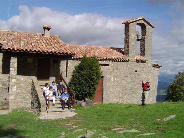 La ermita tiene una parte convertida en refugio libre y otra guardado. Seguimos hacia la cima y en pocos minutos llegamos al pequeño collado de Joanetes, al pie del Puig dels Llops (1:50h-9km), donde tomamos el sendero de la derecha siguiendo las trazas rojas y azules. Una fuerte subida nos conducirá a la cresta. Ante nosotros aparece la primera cumbre, el Puig dels Llops (2:15h-10,2km) con una gran vista de la vall d'en Bas. Volvemos a la cresta para afrontar la última subida al Puigsacalm (2:30h-11,7km). Desde la cima podemos ver el Pedraforca, el Canigó, el Montseny, Cabrera y toda la comarca de la Garrotxa.