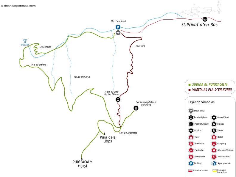 Ruta circular y subida al Puigsacalm (1515m) desde el pla d'en Xurri (650m) pasando por el Salt de Sallent, Sta. Magdalena del Mont y bajando después por la ermita de “Les Olletes”. Se puede realizar en cualquier época del año