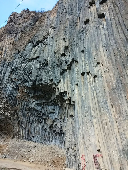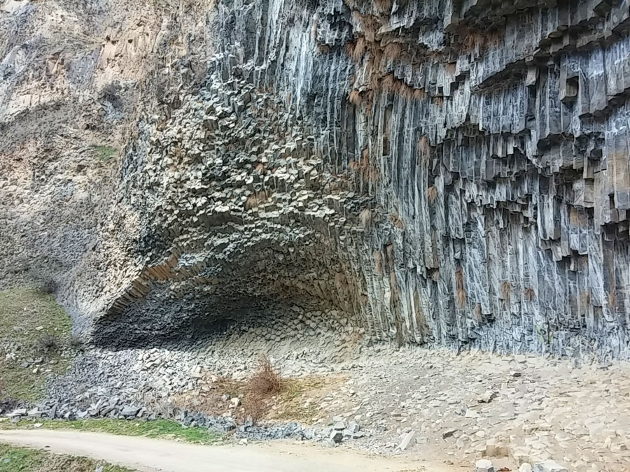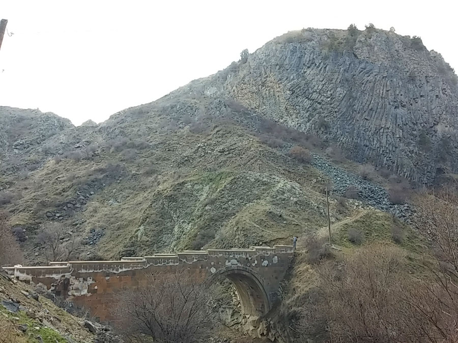 Al final del camino volveremos a encontrarnos con el cartel Khosrov Forest - State Reserve, pero esta vez no seguiremos recto sino que iremos a la derecha (F. 10). Bajamos por el camino de tierra (F. 11) y después encontraremos un puente medieval (F. 12/13) restaurado. En el camino veremos a la derecha la primera zona de interés de la ruta la espectacular Sinfonía de las Piedras (F. 14/15/16/17). Seguimos avanzando en el camino (F. 18) y podemos divisar el Templo de Garni a lo lejos en la cima de la colina (F. 19). Aquí es donde en principio hay el sendero que nos conduciría al templo pero que encontramos cerrado por unas vallas azules. (F. 20).