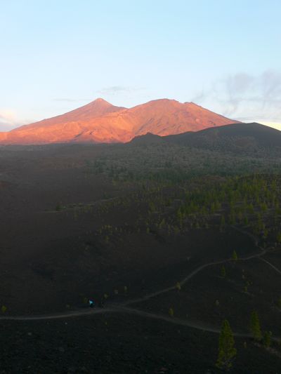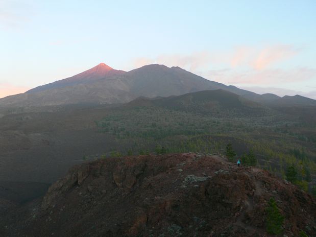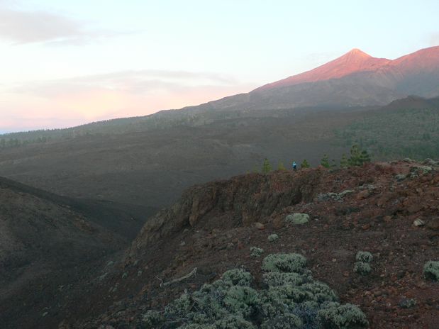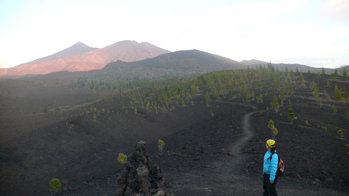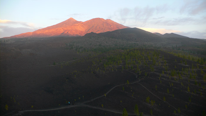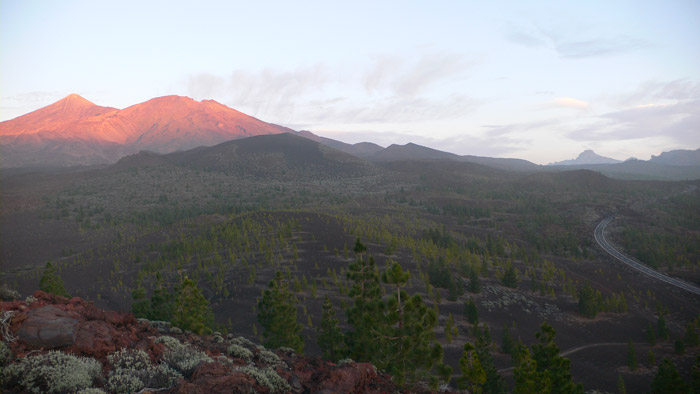 El mejor momento para iniciar este breve paseo hasta la cima del cráter del volcán Samara (1936 m.s.n.m.) es al atardecer con los colores rojizos de la puesta de sol sobre la Corona forestal de Tenerife y el emblema de la isla la omnipresente montaña del Teide.