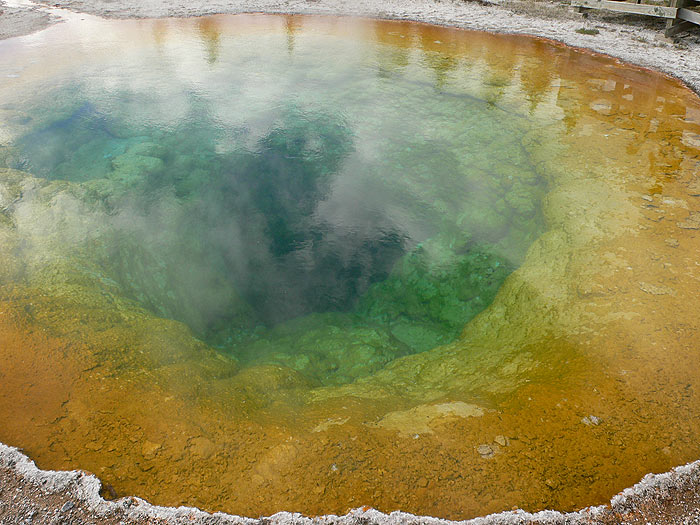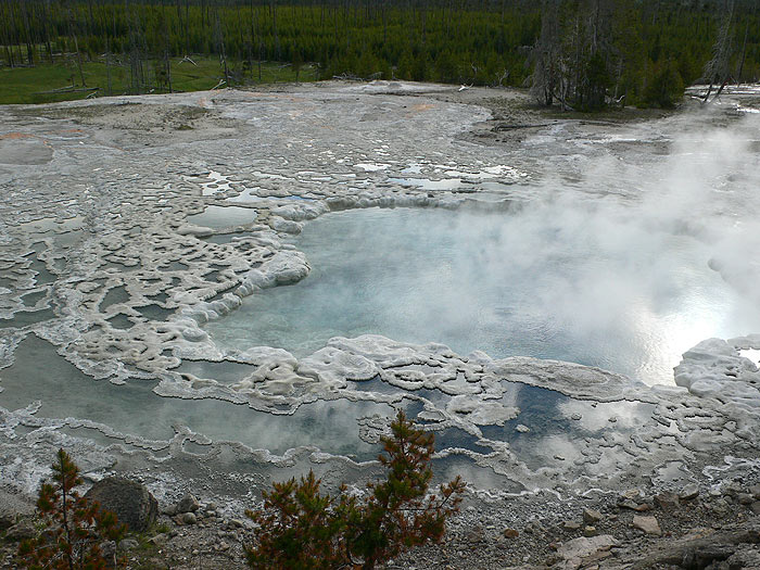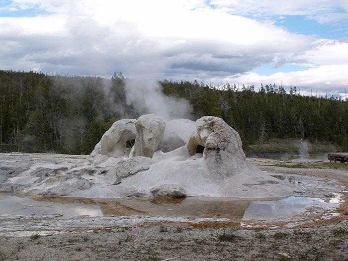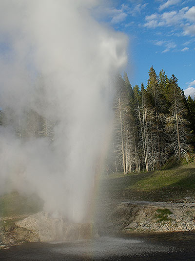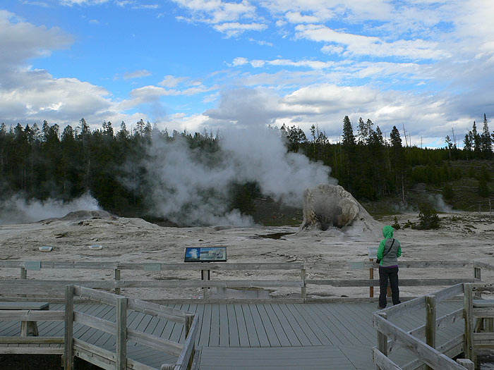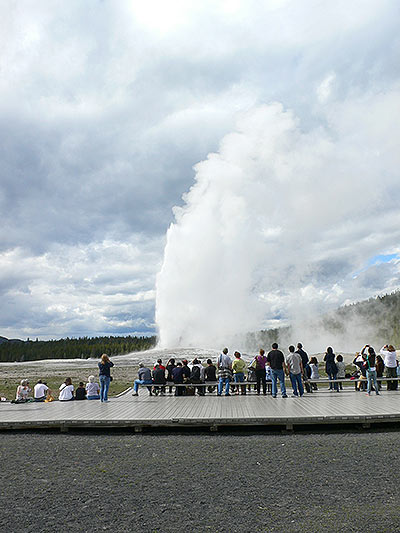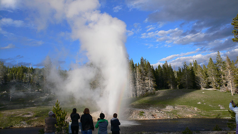 Casi desde el mismo estacionamiento podemos ver uno de los espectáculos más visitados del Parque de Yellowstone, la erupción del géiser Old Faithful. ¿Porqué es tan popular este géiser? Como su nombre indica -el viejo Fiel- lo es por su puntualidad eruptiva que se mantiene a lo largo de los años y no tanto por su altura, nada despreciable -más de 70 metros-
