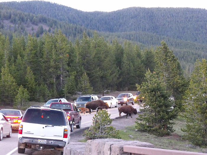 Por suerte en Yellowstone todo puede ocurrir, cuando ya piensas que la ocasión para avistar fauna ha terminado te puedes encontrar con una caravana de coches bloqueada en la carretera por una nutrida manada de bisontes. Es curioso pero en la carretera es donde se producen más avistamientos -además de practicando backpacking- y protegidos por el refugio del coche se disfrutan con mucha tranquilidad.