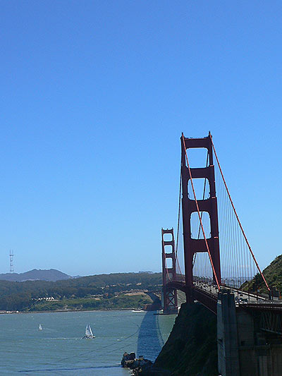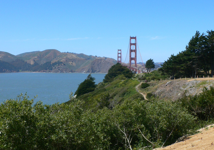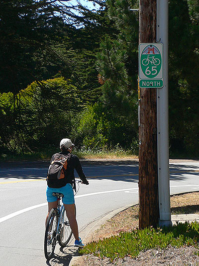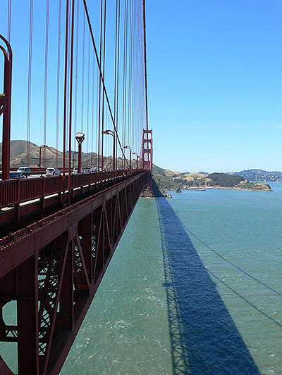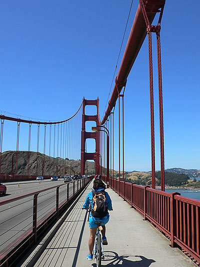 Seguiremos en bajada la ruta señalizada 65-Norte que nos conducirá al puente del Golden Gate. Una entrada no muy bien señalizada nos da acceso a una plataforma habilitada para caminantes y ciclistas separada del tráfico, segura aunque abarrotada de turistas y deportistas locales.