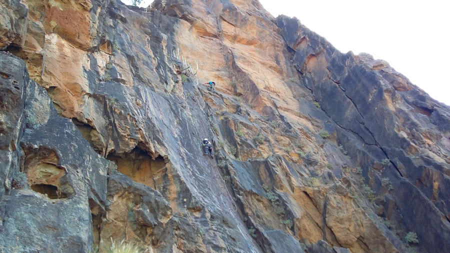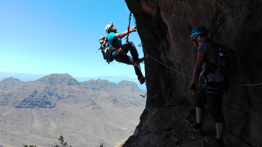 Dado que la vía se encuentra en los Andenes de Tasarte hay que superar paredes cortas con zonas de tránsito entre una y otra, así que, si bien ganas altura rápido, el esfuerzo físico es corto y hay muchos descansos donde recuperarse.
