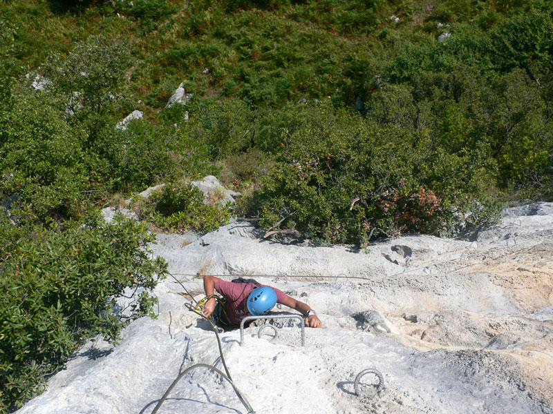 Como hemos comentado ésta es más fácil y corta que la primera, empieza con un flanqueo en una faja y sigue por un paso vertical bien equipado que sube rápido. Pronto llegamos al final de la pared sin haber igualado las sensaciones de la primera parte pero con grandes vistas sobre el valle.