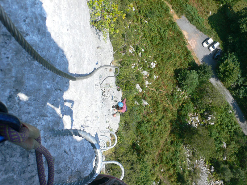 Leyendo los comentarios me gustaría recordar que la gracia de las ferratas así como su nivel consiste en hacerla sin usar el cable de vida para subir, solo para asegurarse. En el momento que cogemos el cable estamos quitándole la dificultad al paso y puede parecernos un nivel inferior