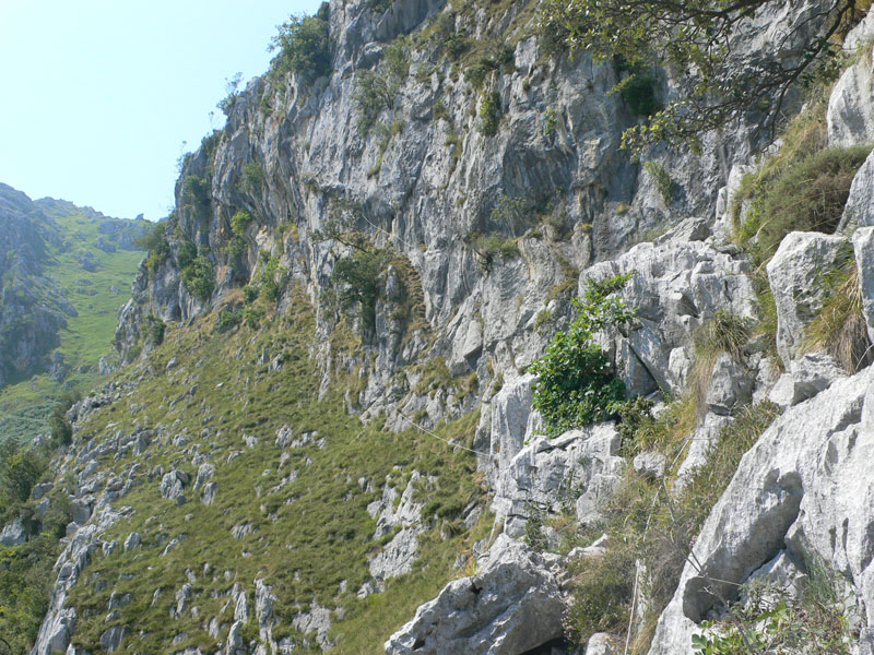 Llegamos al tramo intermedio, de transición entre paredes. Los equipadores reseñan que hay una línea de rapeles para escapar de la vía -cuerda de 30 metros-. Nosotros seguimos de frente. Después de una caminata, asegurada con cable en todo momento, la ladera herbosa es muy traicionera hasta en seco, accedemos a la segunda pared.