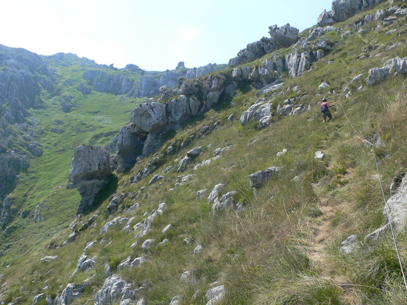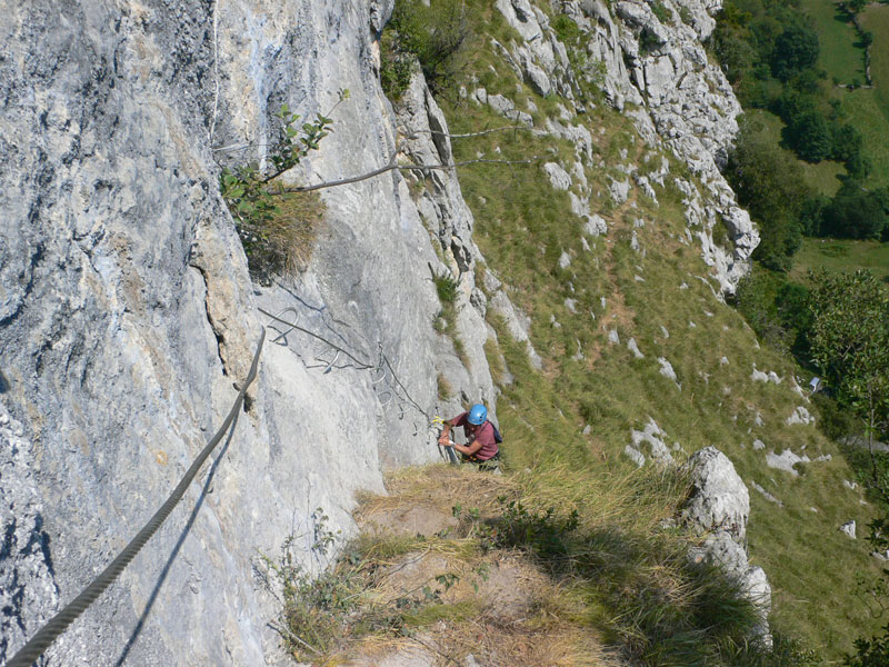 La vía sigue subiendo por la ladera sin ninguna trepada siempre siguiendo el cable de seguridad, hasta dar con una última pared, anecdótica. Al poco rato llegamos al camino de pastor de Buzulucueva, nuestra senda de regreso al coche.