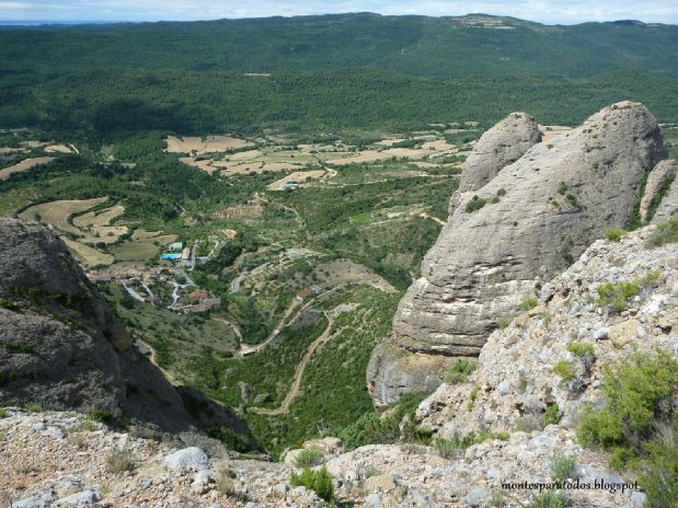 Siendo una ruta corta merece la pena complementarla haciendo la ruta circular de los Mallos. Se continua por el camino hasta el collado de San Pedro, 850m altitud, una pista desciende por la otra vertiente. Alcanzamos un llano con un cruce de senderos: A la izquierda un camino hacia Agüero cierra la ruta, recto la pista nos lleva a otro cruce.