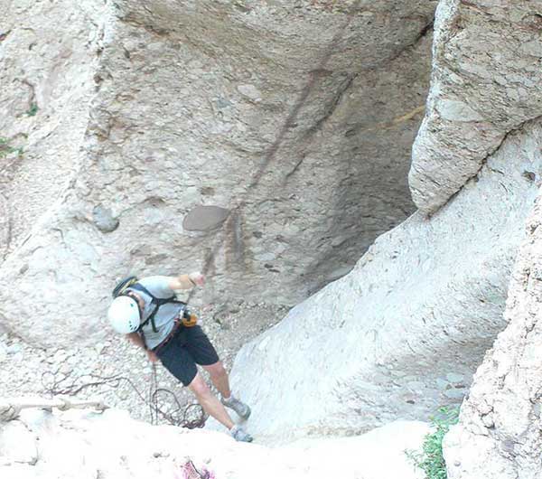 Continuamos bajando entre moles de roca y nos topamos con dos nuevos rápeles de 6 metros cada uno, demasiado distanciados como para encadenarlos. De nuevo lo más difícil es encontrar una buena posición de salida. Para la subida, una cadena por el lateral te permite subir el desnivel otra vez a pulso.