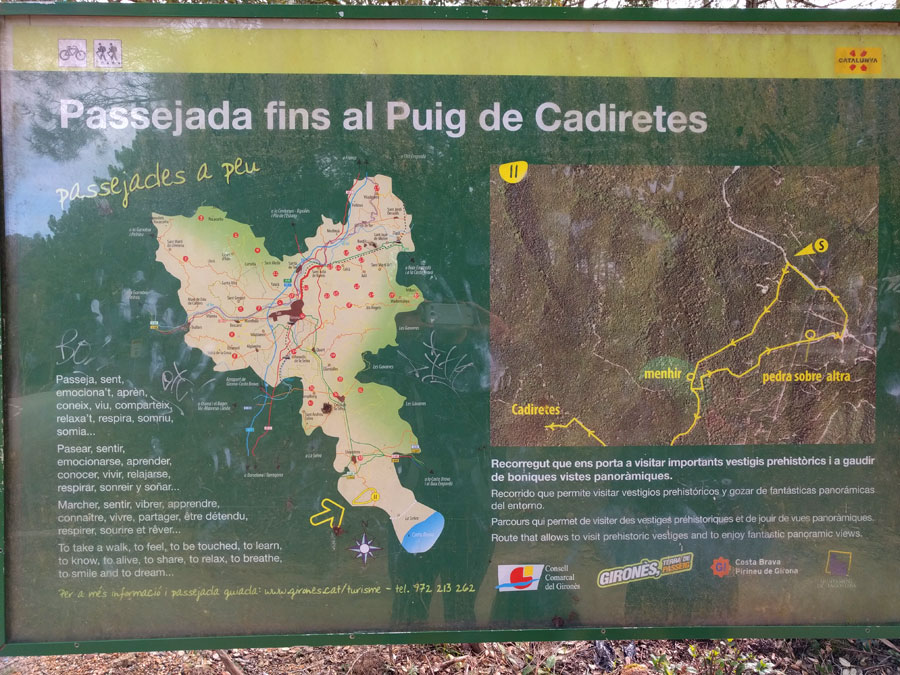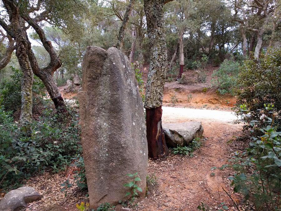 Ya que el paso equipado es tan corto aprovechamos para hacer una salida circular por las amplias pistas del Massís de Cadiretes que nos llevarán hasta su cima más alta el Puig de Cadiretes de 518 metros de altura y gran mirador de la zona. Estaremos siempre rodeados de bosque de pino y de alcornoque que esconde monumentos megalíticos singulares como el Menhir d’en Llach y la Pedra sobre altre el objetivo final de la salida.