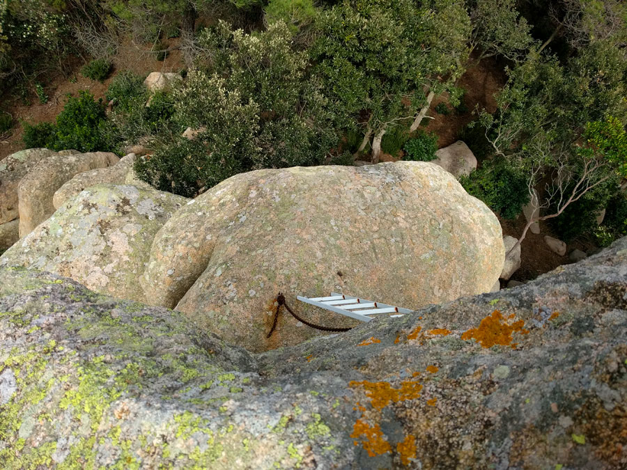 Para subir a la parte alta tenemos que buscar la cara norte del apilamiento. Trepamos un primer bloque hasta llegar a un paso muy estrecho -con mochila no se puede pasar- que nos lleva a un balcón natural con unas bañeras talladas en la roca. Estamos un bloque por debajo de la escalera blanca de unos 2 metros. Trepamos hasta el pie de la misma por un paso escalonado. Ya en la escalera nos ayudamos de una cadena y tiramos de brazos para llegar hasta arriba dónde hay dos escalones tallados en la piedra. Estaremos unos 7 o 8 metros sobre el suelo en una posición bastante incómoda. Podemos ver desde lo alto una inscripción en la roca -de 1799- con el nombre del sitio.