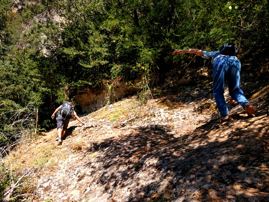 De aquí en adelante nos esperan los pasos más exigentes, especialmente dos, un paso asegurado con cuerda donde nos deberemos estirar y una prolongada subida un tanto descompuesta en la que nos ayudaremos de los árboles para poder subir. Después encontraremos un paso de cadena fácil y ya sobre el pont Cabradís una bajada pronunciada de 20 metros equipada con cadenas primero y una cuerda anudada hasta llegar a la boca sur.