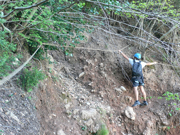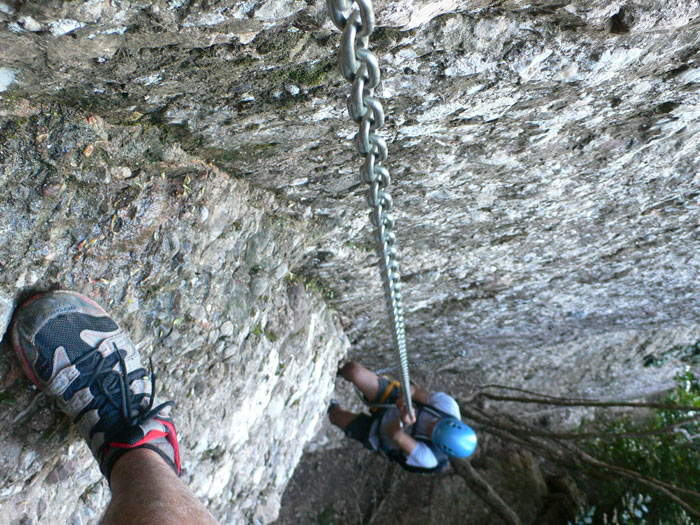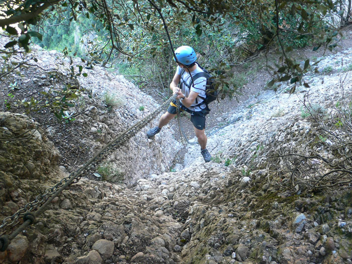 El siguiente paso lo encontramos en una zona muy aérea y por suerte parcialmente protegida con arbustos. Se trata de una cuerda anudada y una cadena de unos 6 metros que debemos destrepar. A partir de aquí es más que recomendable el arnés con baga corta e imprescindible el casco.