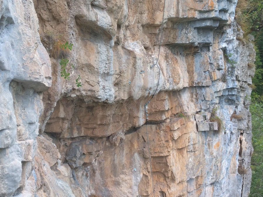 Poco se parece a una vía ferrata es más bien como una vía cable de extrema dificultad. Hay alguna clavija que ayuda en las zonas desplomadas lo que la aleja de las vías cable tradicionales aun así le va más la etiqueta que no el de vía ferrata. A nuestro parecer queda reservada a escaladores con buen nivel (mínimo VI grado) equipados con pies de gato y asegurados desde arriba para evitar sustos. Visto lo visto una tentativa nuestra queda del todo descartada.