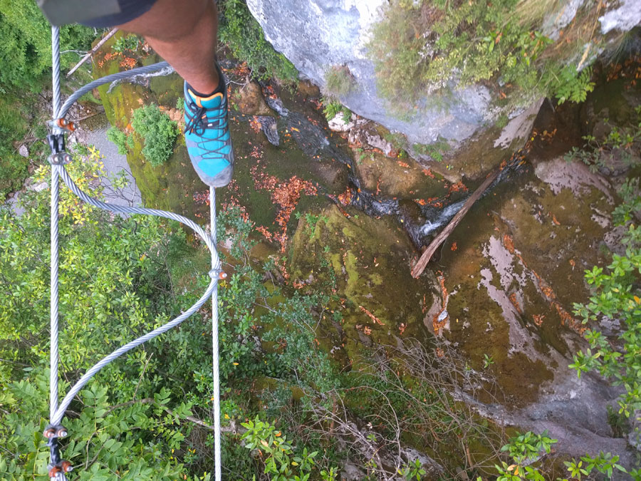 Seguimos la vía cruzando el puente colgante que salva la cascada y ganamos altura por el espolón de color rojo, vertical y exigente pero equipado con abundante material. Para cerrar la vía ferrata vamos a buscar el puente Escondido, un tibetano que nos permite hacer una vuelta hasta la entrada del puente del Cielo, situado unos 200 metros por encima del río Sella y justo sobre la cascada de Aguasaliu. Un imprescindible para acabar la actividad.