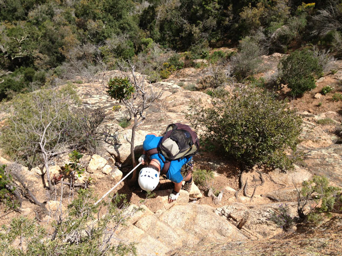 La aproximación fue sencilla de encontrar, pero una vez puestos en faena, en el segundo tramo te quedas en mitad de la pared sin posibilidad alguna de continuar. Tuvimos que elegir entre rapelar hacia ningún lado interesante o dar la vuelta, y aquí se acabó la vía.