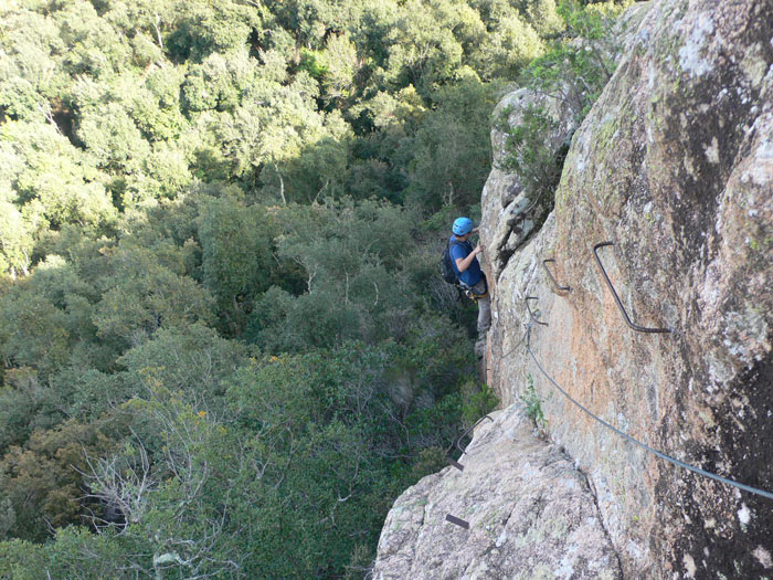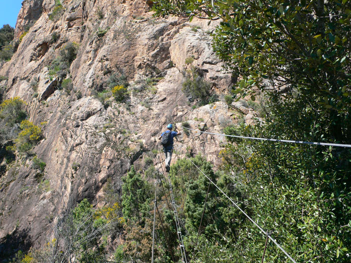 En cuanto a lo de la seguridad de la instalación, sí que hay algún cable deshilachado, pero no está en ningún punto comprometido. Y las instalaciones para rapelar cumplen fielmente con su cometido. Que sí, que hay un poco de oxidación por aquí, o una chapa con un poco de juego por allá, pero es una vía ferrata de puta madre, y te hace sentir como si estuvieras en otro mundo (y no como en la mierda de ciudad en la que vivo) y es gratis, y en lugar de quejarnos tanto y de ser tan exquisitos, podríamos ponernos en contacto con Albert Gironés y, después de agradecerle la proeza de montar por su cuenta semejante maravilla para que luego unos ingratos como nosotros vayamos a disfrutarla por la cara, podríamos quizá autoinvitarnos a echarle una mano con el mantenimiento. ¿Cómo lo ves?