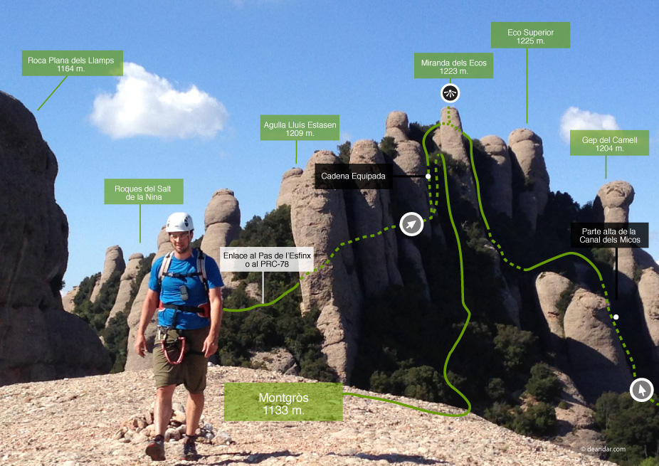 Cruzamos la carretera en busca del GR-172 que seguimos al oeste hasta la entrada de la Canal de la Font de la Llum, desvío que tomamos a la izquierda. Subimos hasta el Portell del Migdia, descendemos por el Torrent del Migdia hasta encontrar un nuevo desvío a mano derecha, indicado con un círculo amarillo y azul. Pronto veremos las primeras equipaciones para llegar a la Canal dels Micos. Siguiendo la canal equipada llegaremos a la cima de la Miranda del Ecos.