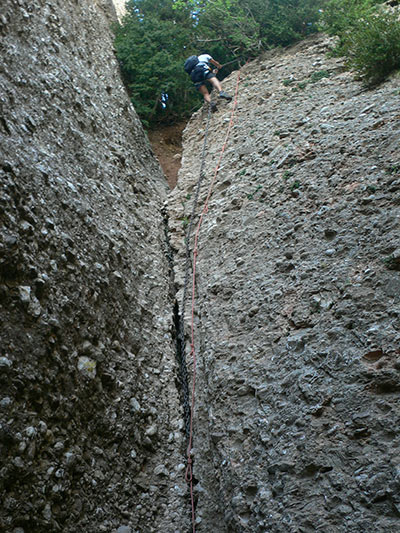 Ahir el vam fer rapelant, i penso que és molt millor fer-lo així. No obstant, al haver-hi una corda i una cadena, també es pot fer a pèl, agafant-se a les dues coses. Pel rapel és suficient una corda de 30 metres, fent la reunió al mateix arbre on està agafada la corda i la cadena. Molt assequible.