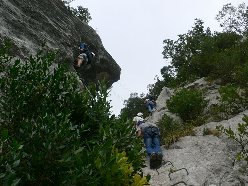 A lo lejos la estrecha diagonal por la que sube la vía ferrata impresiona, las paredes caen verticales e incluso desplomadas alrededor. En total son 120 metros de desnivel y 200 metros de recorrido a superar.