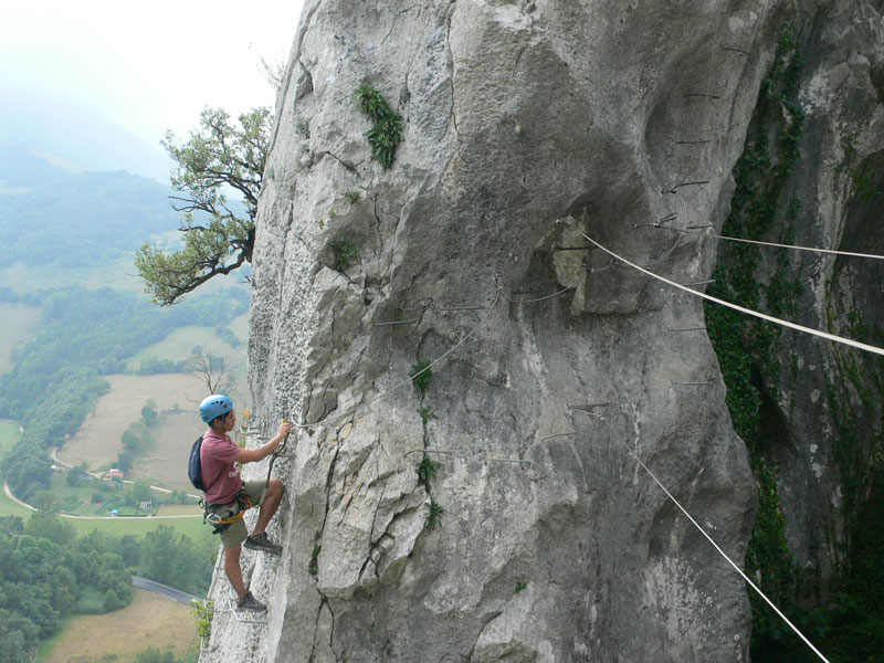 Excelente ferrata de iniciación. Esta muy bien diseñada para niños o gente que nunca ha echo una ferrata, pues a mitad de camino se divide en dos: Una facil y otra un poco mas complicada con un desplomado y un tibetano. Ademas es sencillo venir con gente que no ha echo ferratas, pues en la oficina de turismo del pueblo alquilan equipos completos ( 9 eurillos).Las vistas son expectaculares y en la bajada para los mas avanzados hay una zona de rapel con muy facil acceso (escaleras).