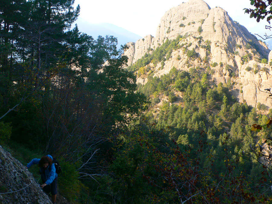 Un poco después de salir de la canal hay el último tramo equipado del camino, dos grapas y cable de acero que superan una parte suspendida y aérea. Una cornisa superior también equipada, que no encontramos, es la alternativa recomendada a este paso delicado.