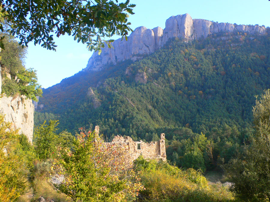 Siguiendo de frente en ligera subida y con amplias vistas a nuestra izquierda sobre los escarpados de la serra de Busa llegamos a la cima del Cinglat. Lo cruzamos por un pasadizo natural a la derecha que nos dará acceso a las ruinas de la masía de Trassera que se encuentran al pie de la pared sur del Cinglat.
